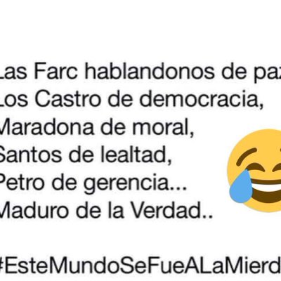 Las Farc hablándonos de paz, Los Castro de democracia, Maradona de moral, Santos de lealtad , Petro de gerencia y Maduro de la verdad 👇👇👇👇👇